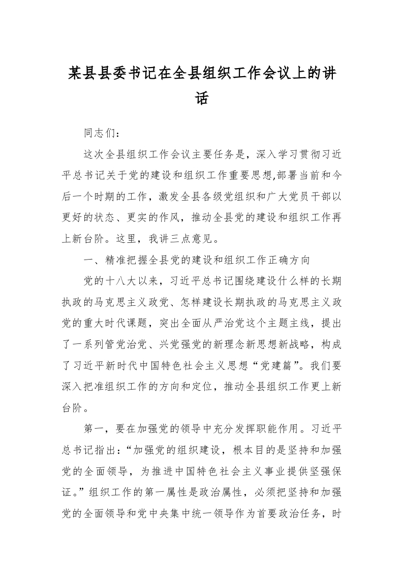 / 某县县委书记在全县组织工作会议上的讲话