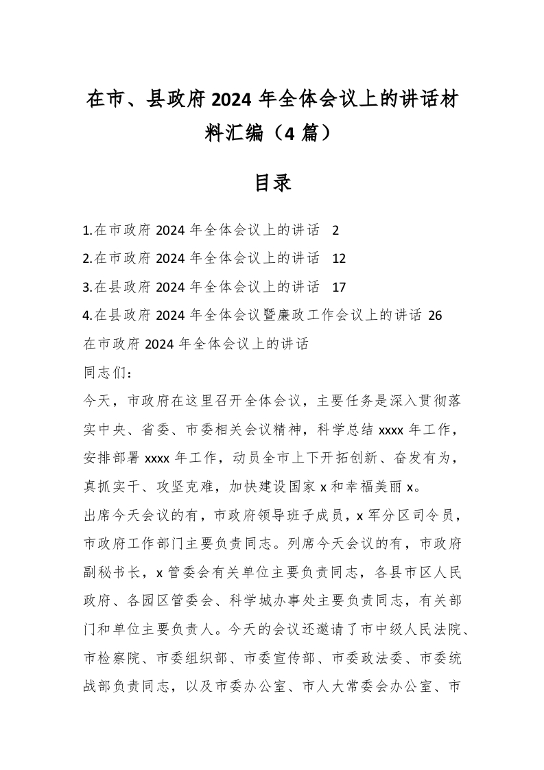 / (4篇)在市、县政府2024年全体会议上的讲话材料汇编