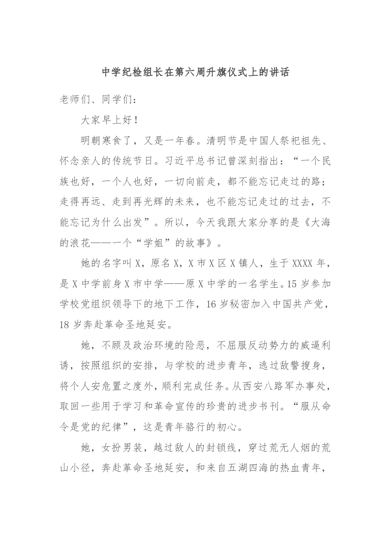 / 中学纪检组长在第六周升旗仪式上的讲话