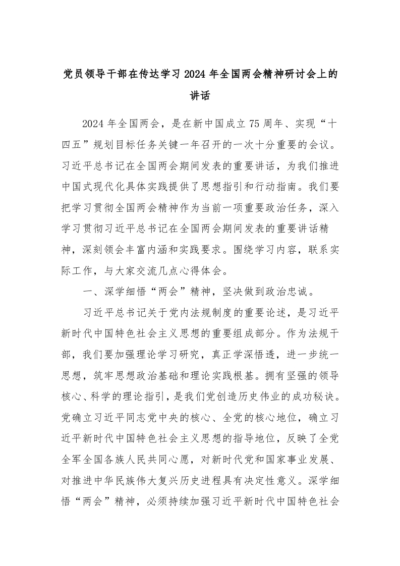 / 党员领导干部在传达学习2024年全国两会精神研讨会上的讲话