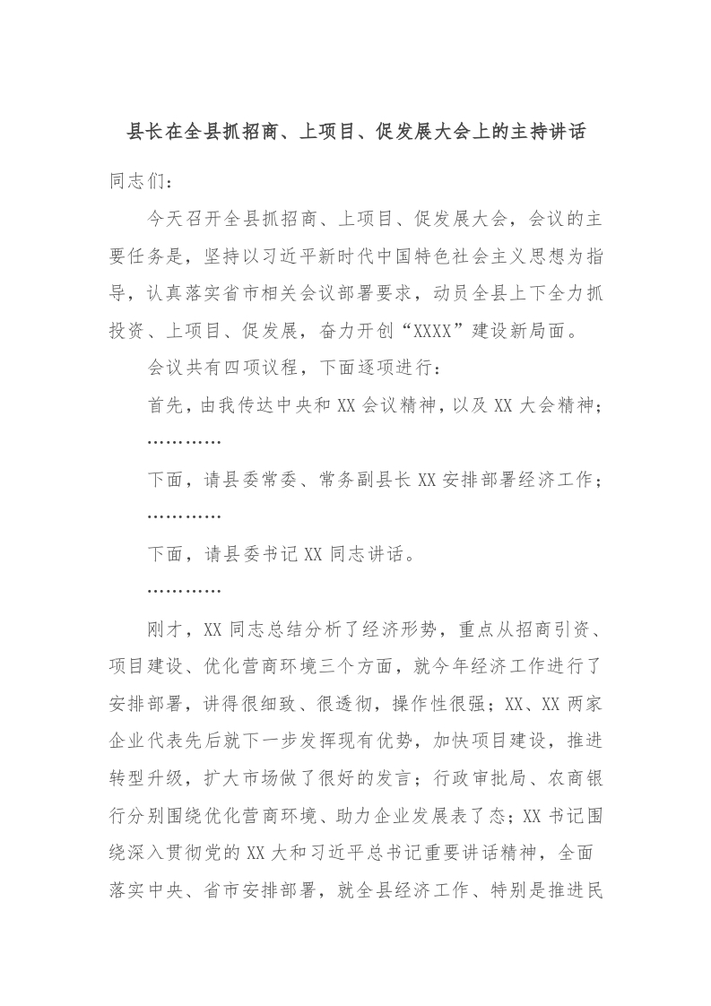 / 县长在全县抓招商、上项目、促发展大会上的主持讲话