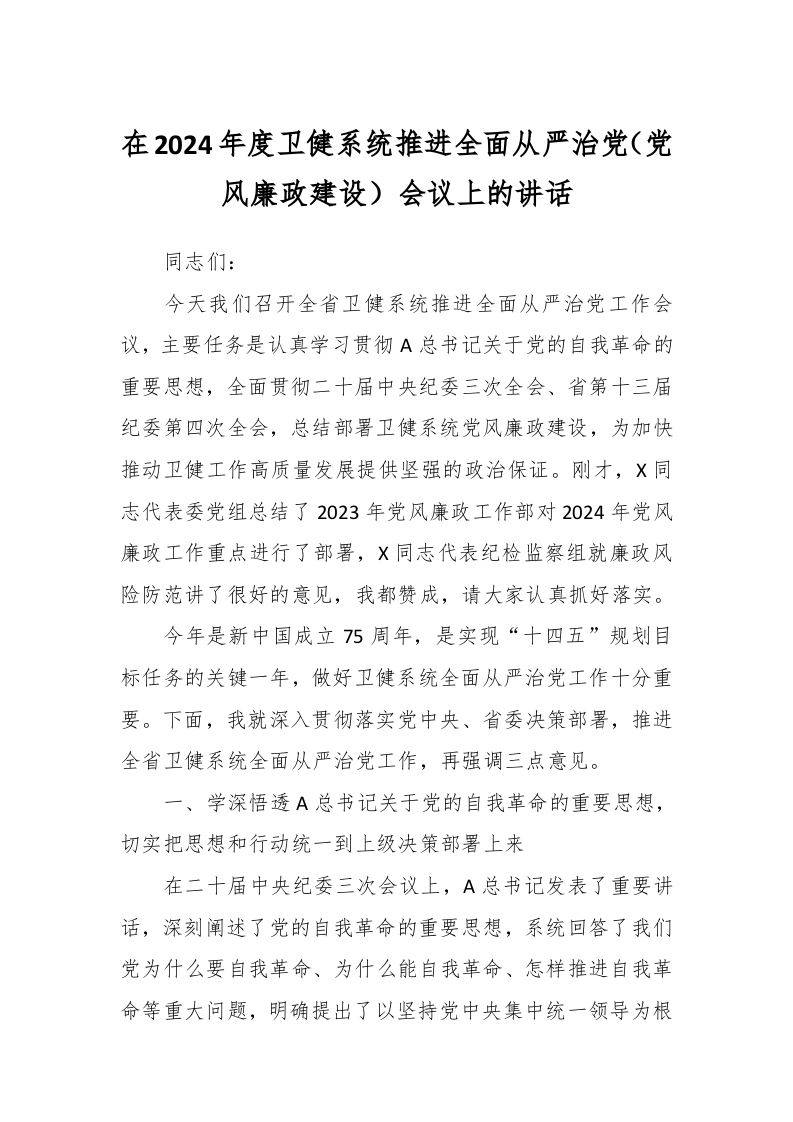 / 在2024年度卫健系统推进全面从严治党(党风廉政建设)会议上的讲话