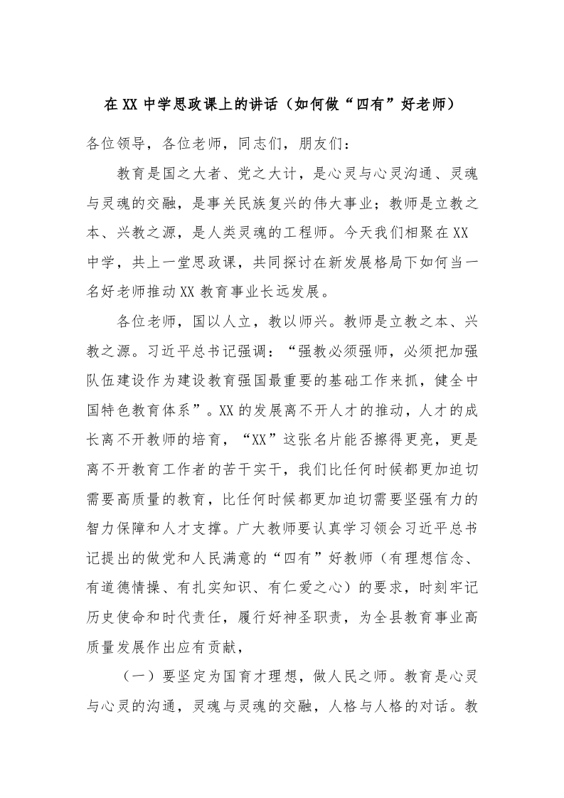 / 在XX中学思政课上的讲话(如何做“四有”好老师)