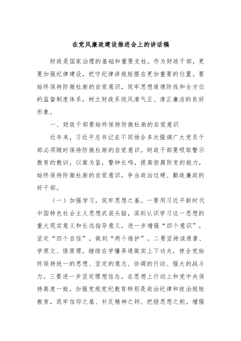 / 在党风廉政建设推进会上的讲话稿