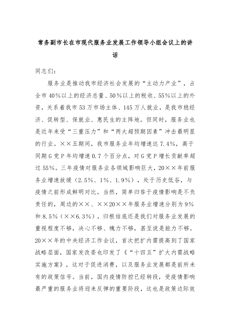 / 常务副市长在市现代服务业发展工作领导小组会议上的讲话