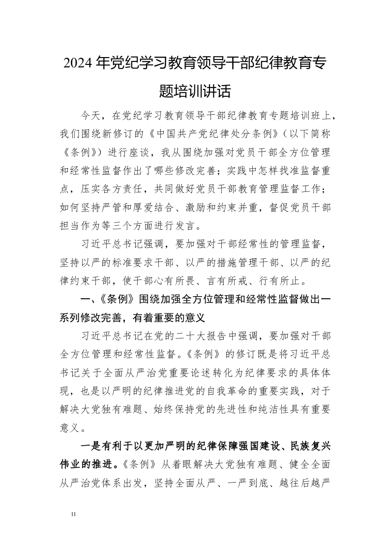 2024年党纪学习教育领导干部纪律教育专题培训讲话