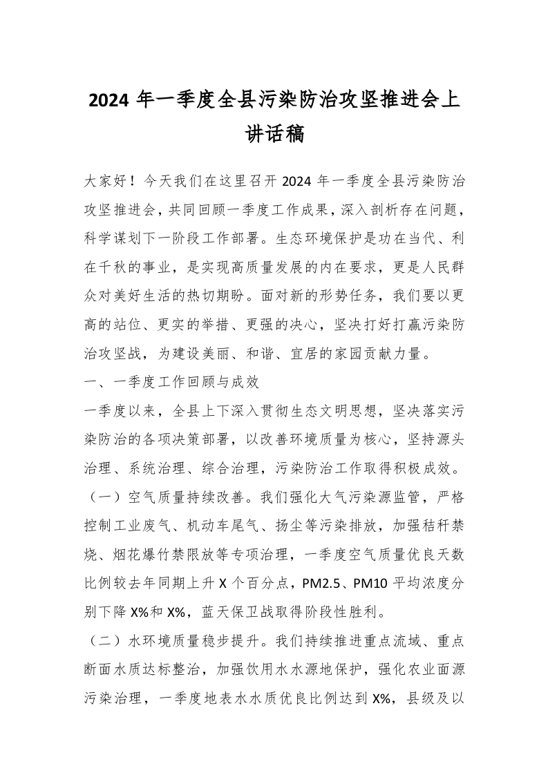 / 2024年一季度全县污染防治攻坚推进会上讲话稿
