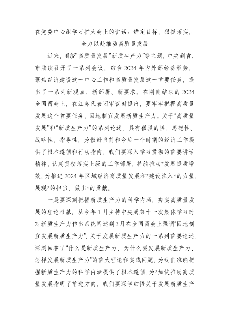 2024年在党委中心组学习扩大会上的讲话:锚定目标,狠抓落实,全力以赴推动高质量发展