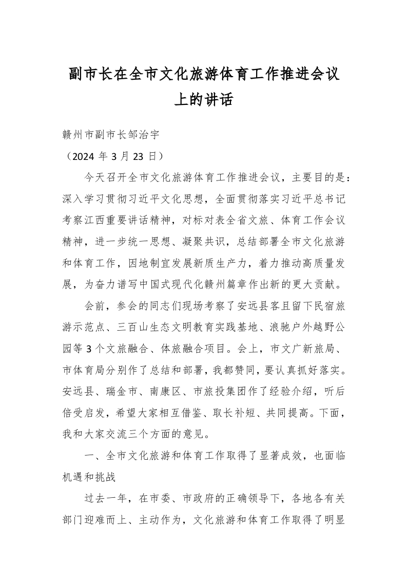 / 副市长在全市文化旅游体育工作推进会议上的讲话
