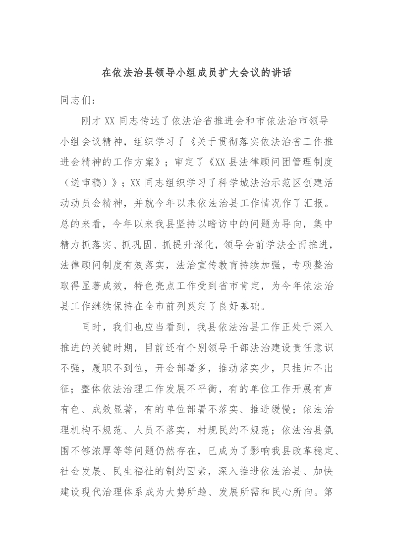 / 在依法治县领导小组成员扩大会议的讲话