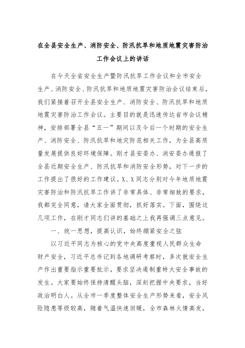 / 在全县安全生产、消防安全、防汛抗旱和地质地震灾害防治工作会议上的讲话