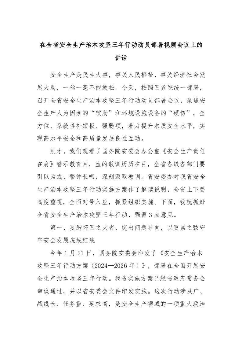 / 在全省安全生产治本攻坚三年行动动员部署视频会议上的讲话