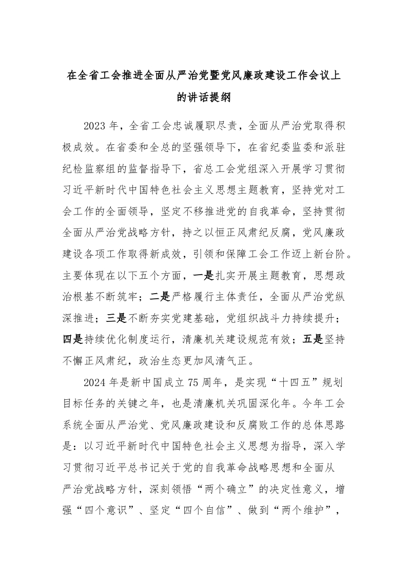 / 在全省工会推进全面从严治党暨党风廉政建设工作会议上的讲话提纲