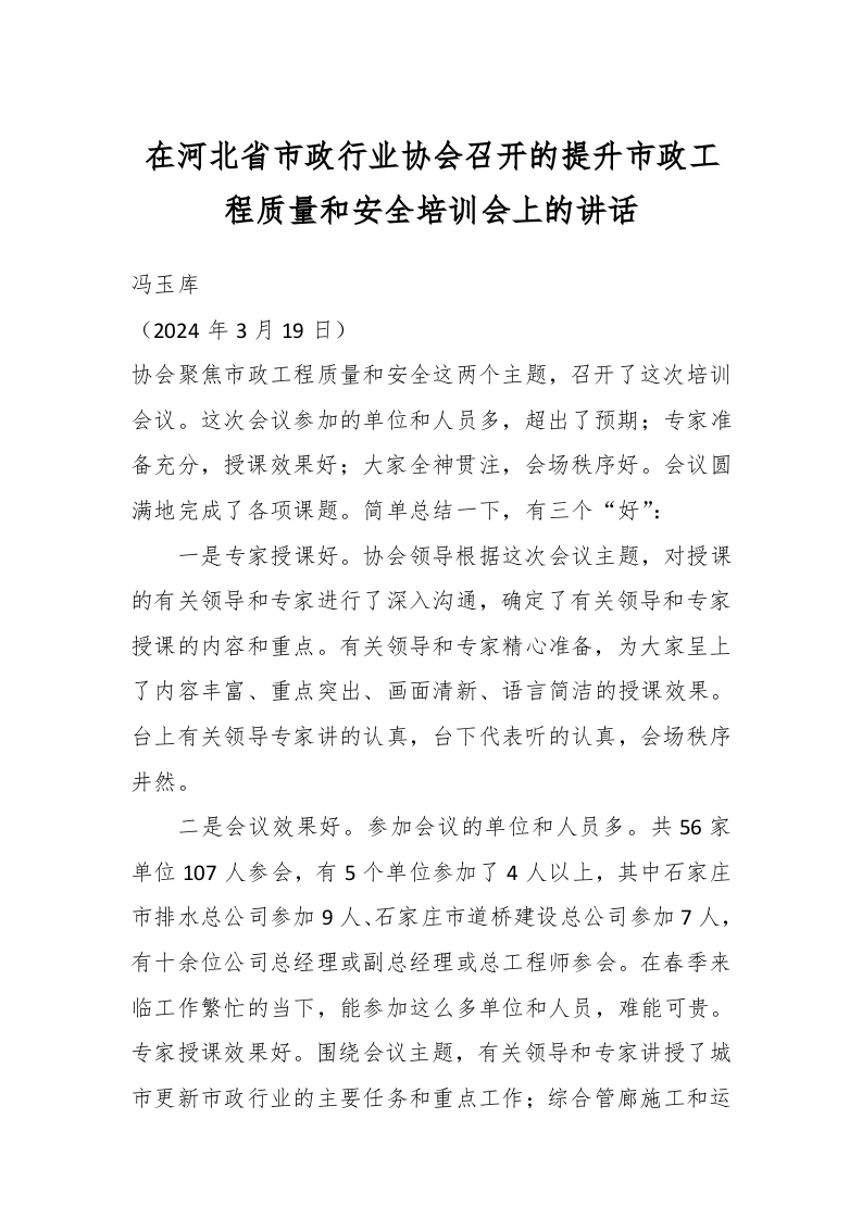 / 在河北省市政行业协会召开的提升市政工程质量和安全培训会上的讲话