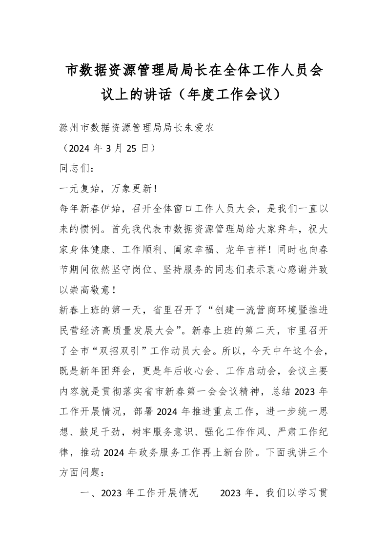 / 市数据资源管理局局长在全体工作人员会议上的讲话(年度工作会议)