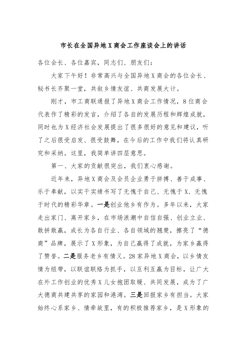 / 市长在全国异地X商会工作座谈会上的讲话