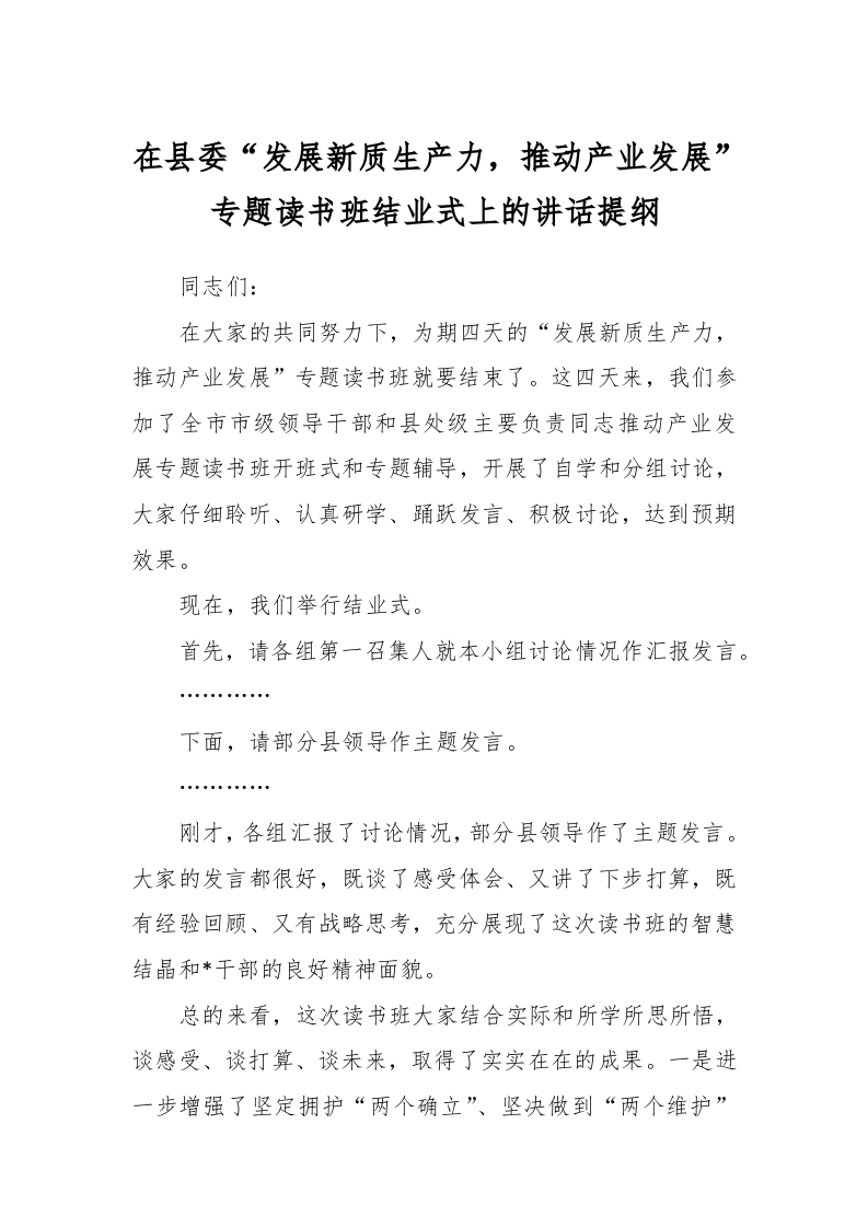 / 在县委“发展新质生产力,推动产业发展”专题读书班结业式上的讲话提纲