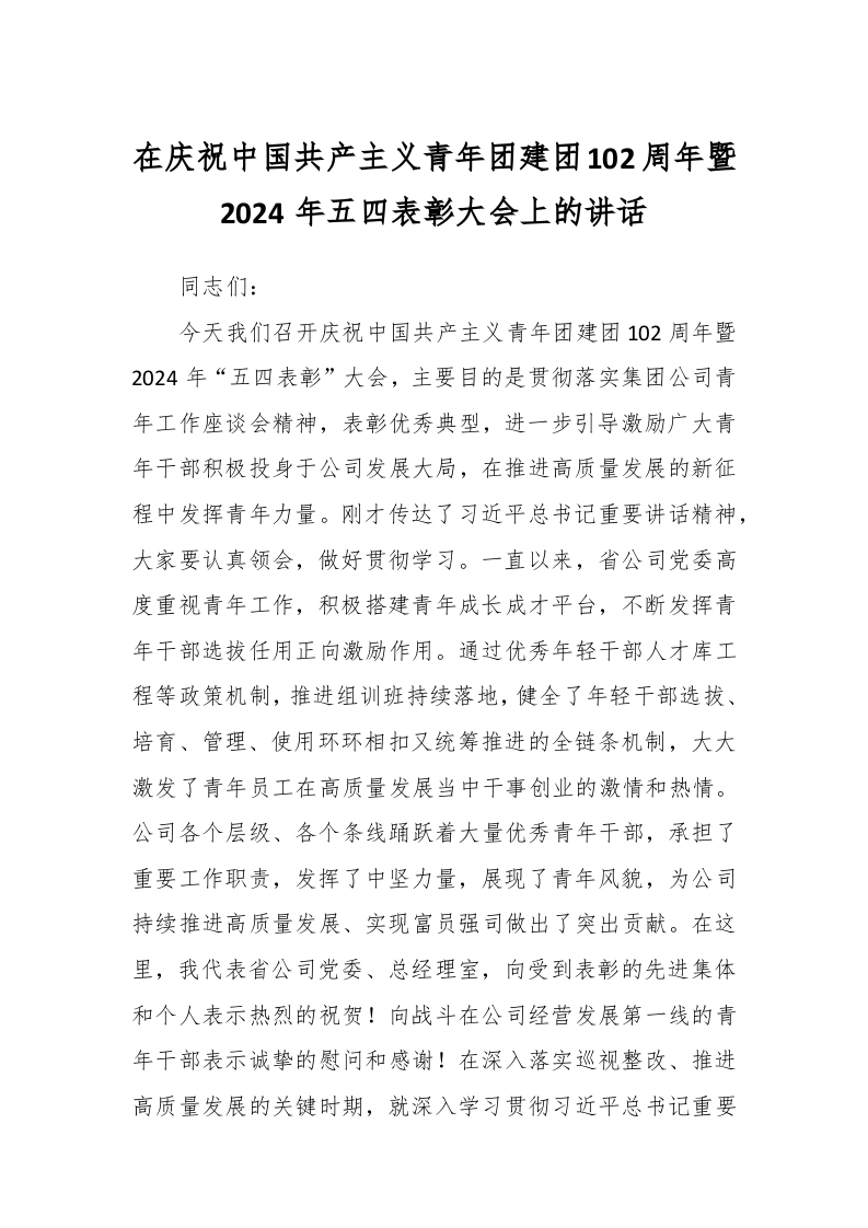 / 在庆祝中国共产主义青年团建团102周年暨2024年五四表彰大会上的讲话