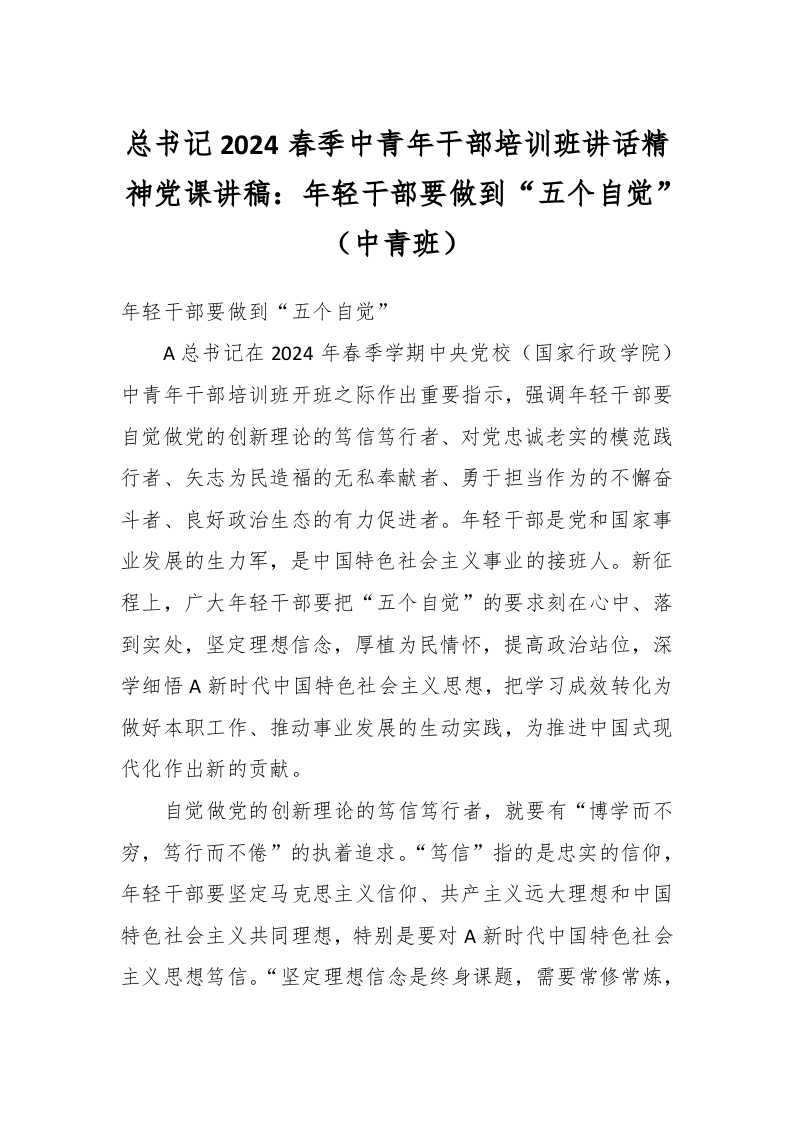 总书记2024春季中青年干部培训班讲话精神党课讲稿:年轻干部要做到“五个自觉”(中青班)