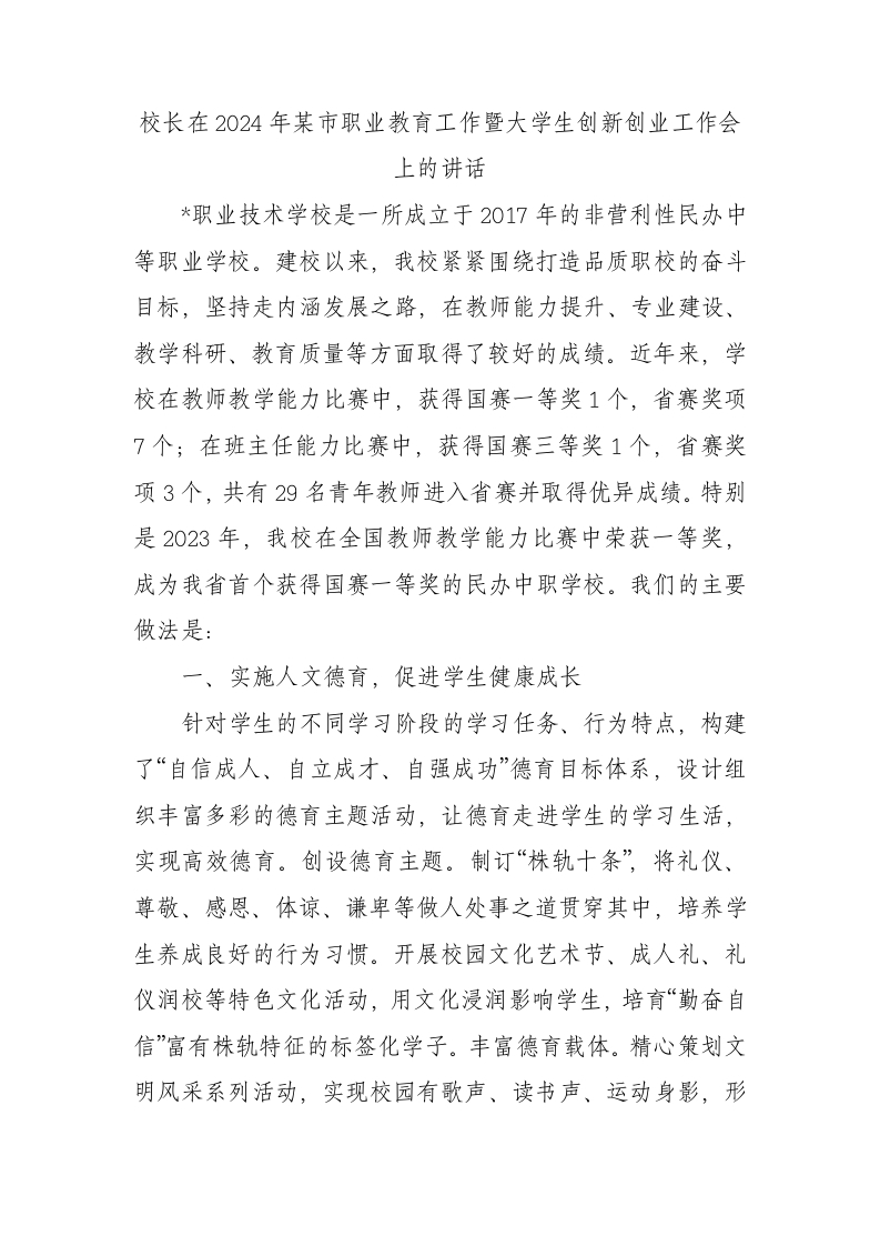 / 校长在2024年某市职业教育工作暨大学生创新创业工作会上的讲话