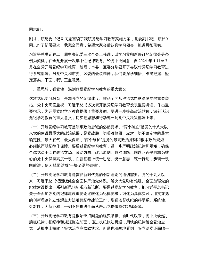 / 在全镇党纪学习教育动员大会上的讲话