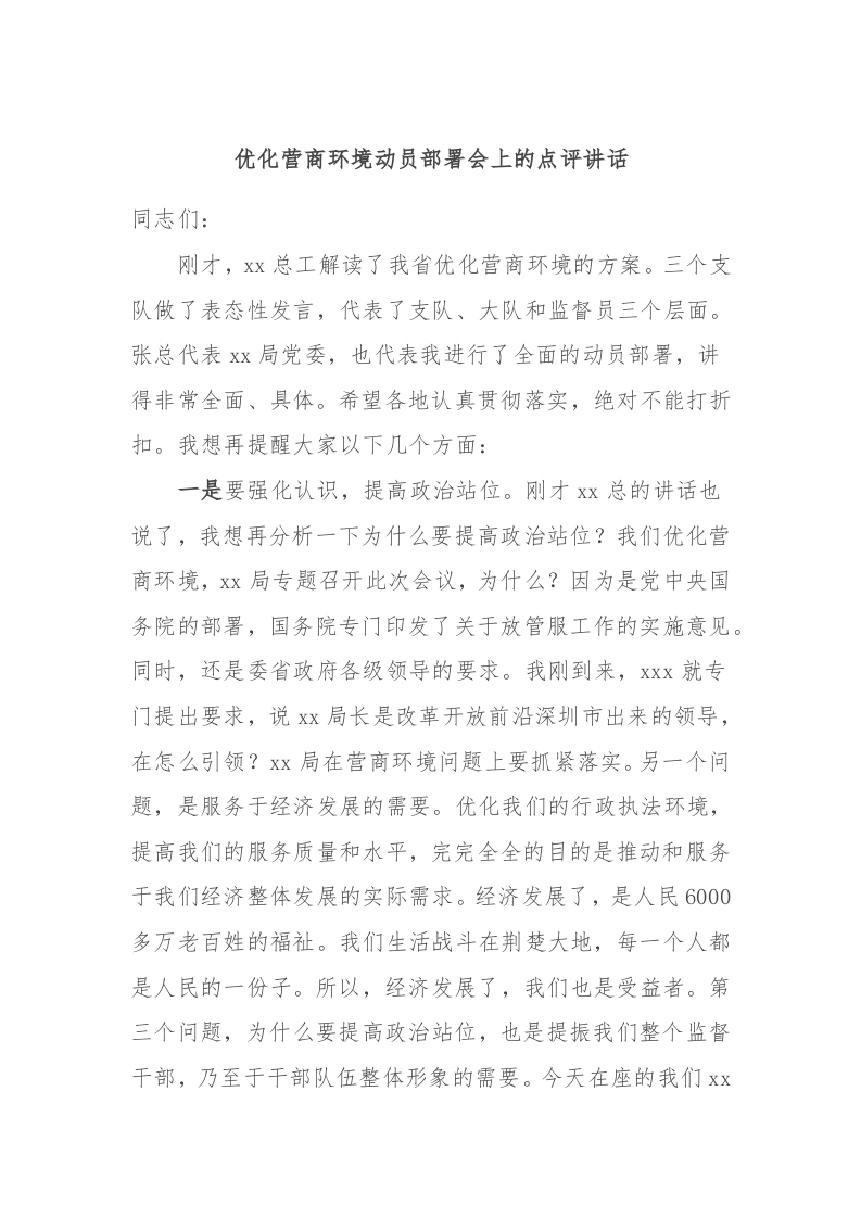 / 优化营商环境动员部署会上的点评讲话