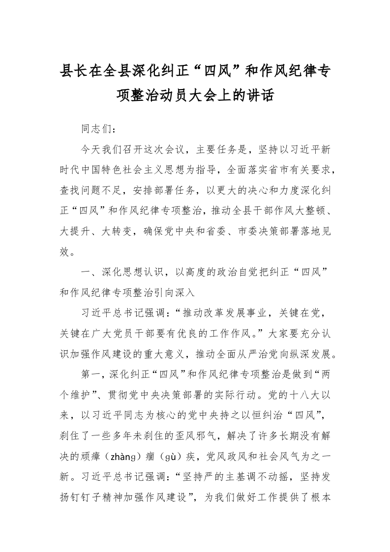 / 县长在全县深化纠正“四风”和作风纪律专项整治动员大会上的讲话