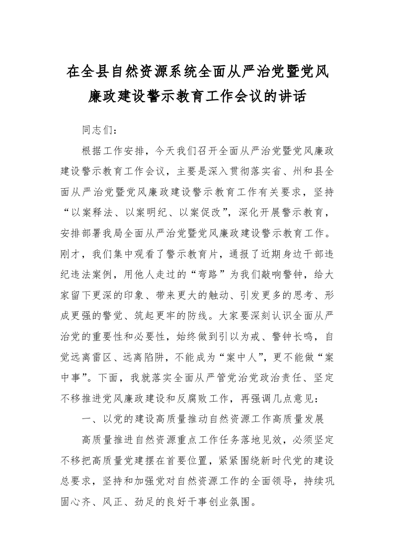 / 在全县自然资源系统全面从严治党暨党风廉政建设警示教育工作会议的讲话