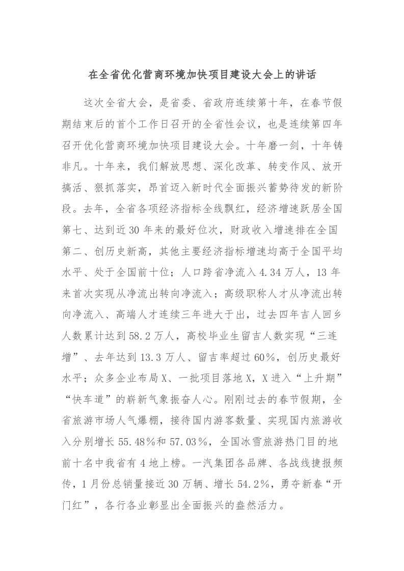 / 在全省优化营商环境加快项目建设大会上的讲话