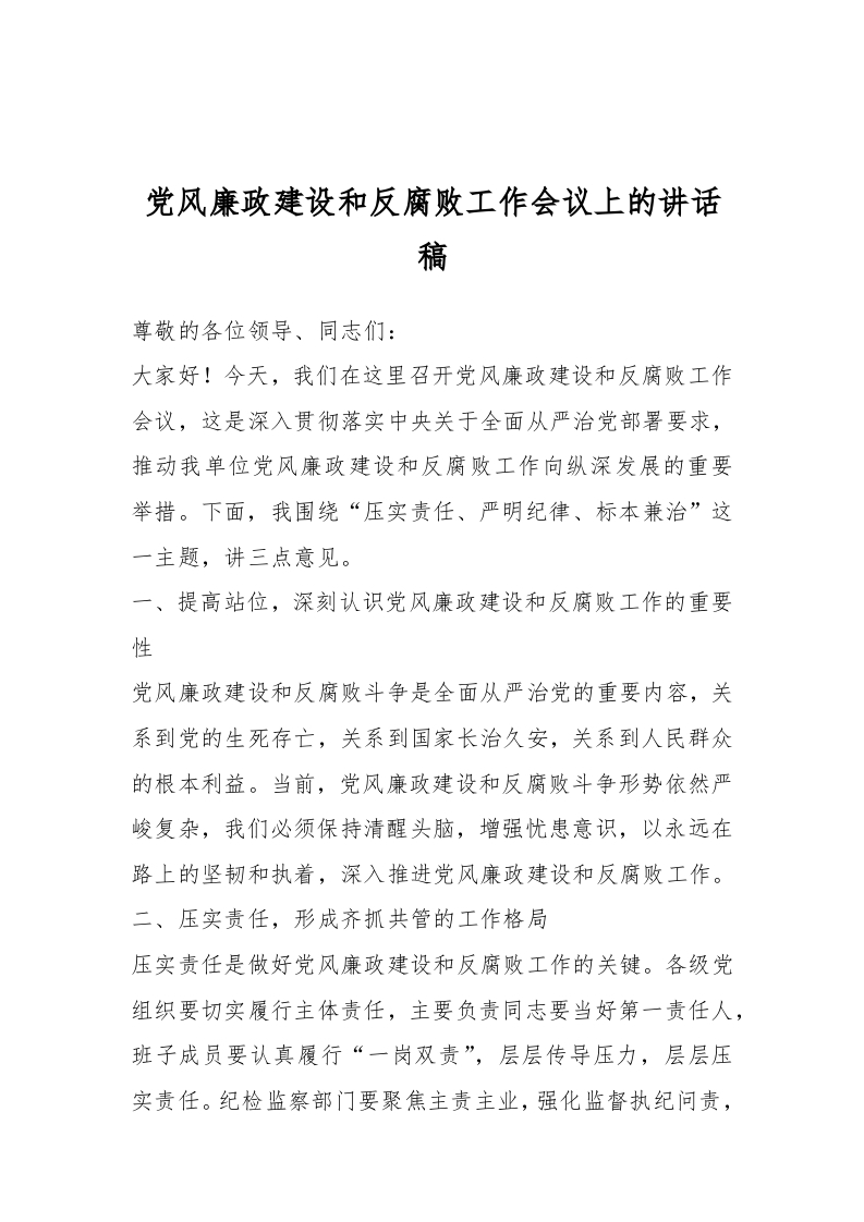 / 党风廉政建设和反腐败工作会议上的讲话稿
