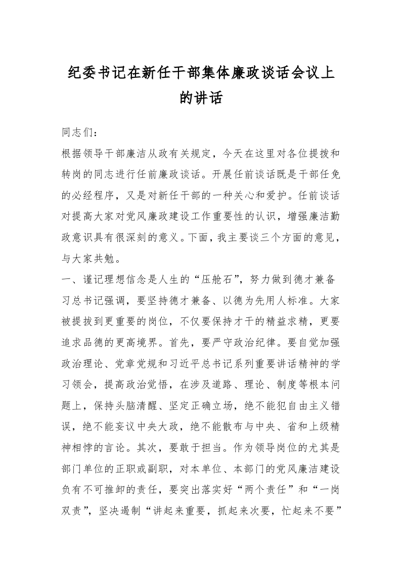 / 纪委书记在新任干部集体廉政谈话会议上的讲话