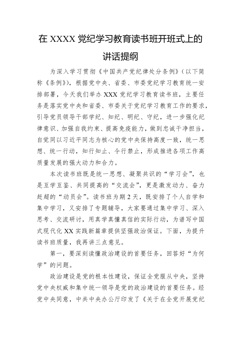 / 在XXXX党纪学习教育读书班开班式上的讲话提纲