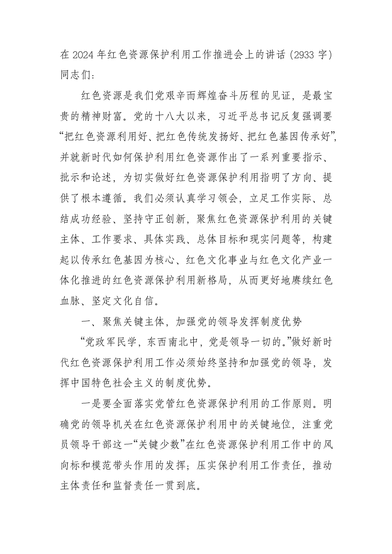 / 在2024年红色资源保护利用工作推进会上的讲话(2933字)