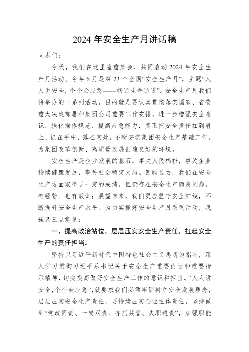 / 2024年安全生产月讲话稿