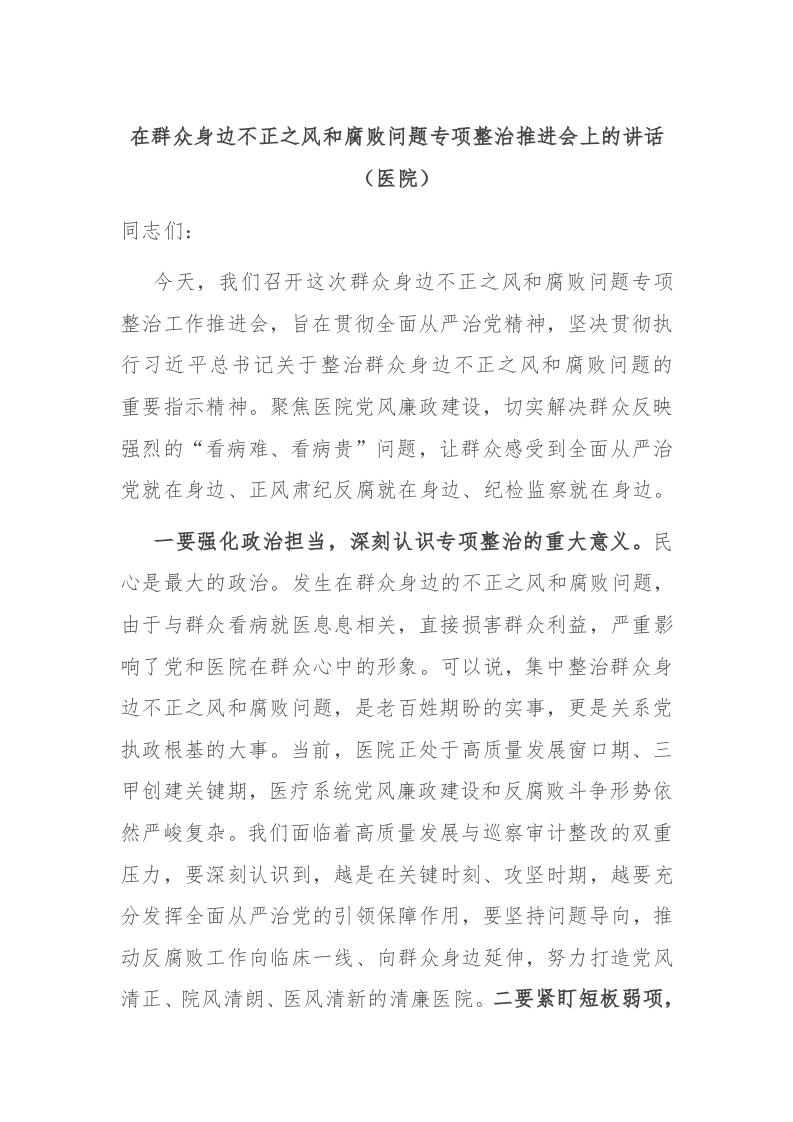 / 在群众身边不正之风和腐败问题专项整治推进会上的讲话(医院)