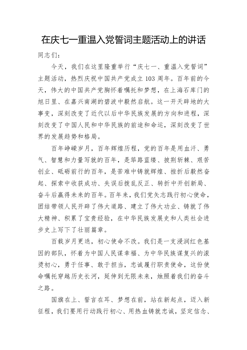 / 在庆七一重温入党誓词主题活动上的讲话