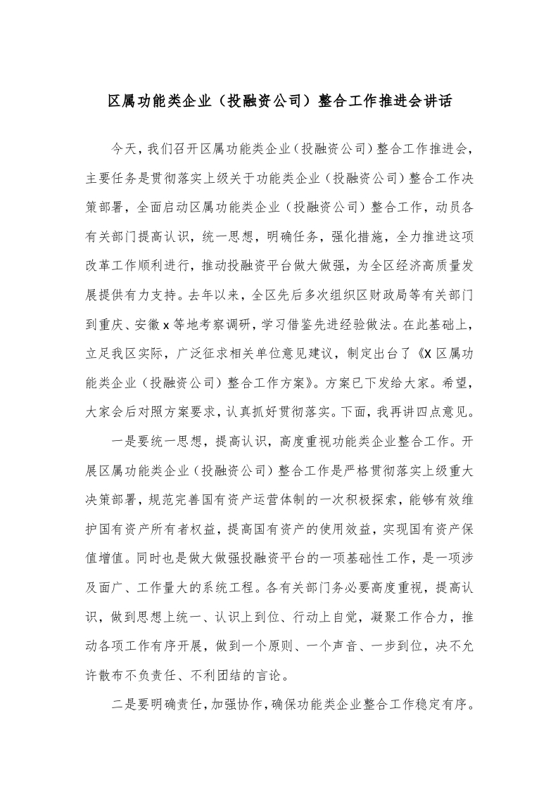 / 区属功能类企业(投融资公司)整合工作推进会讲话