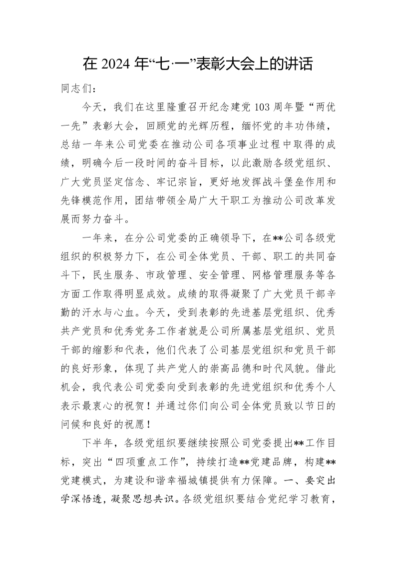 在2024年“七·一”表彰大会上的讲话