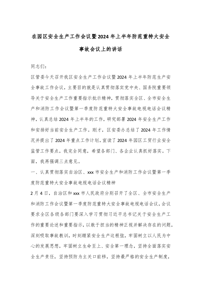 在园区安全生产工作会议暨2024年上半年防范重特大安全事故会议上的讲话