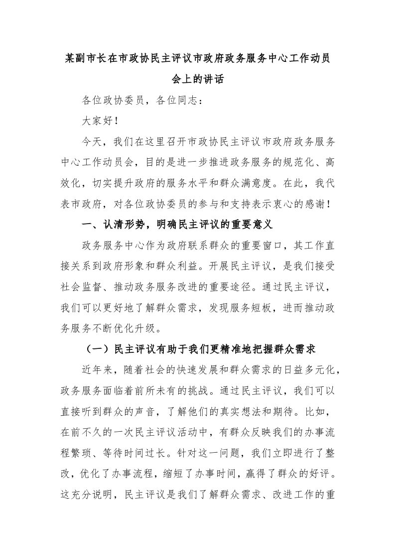 / 某副市长在市政协民主评议市政府政务服务中心工作动员会上的讲话