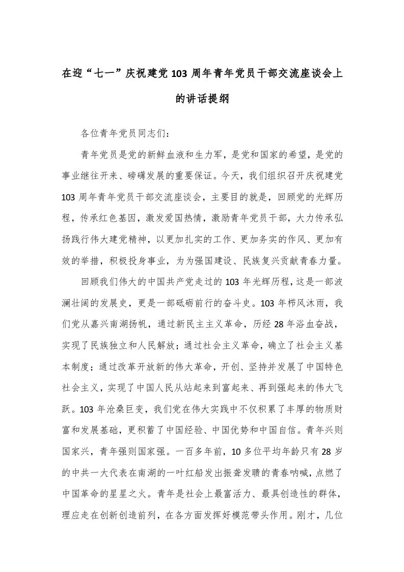 / 在迎“七一”庆祝建党103周年青年党员干部交流座谈会上的讲话提纲