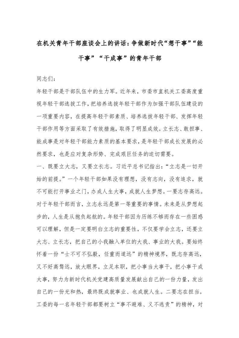 在机关青年干部座谈会上的讲话:争做新时代“想干事”“能干事”“干成事”的青年干部