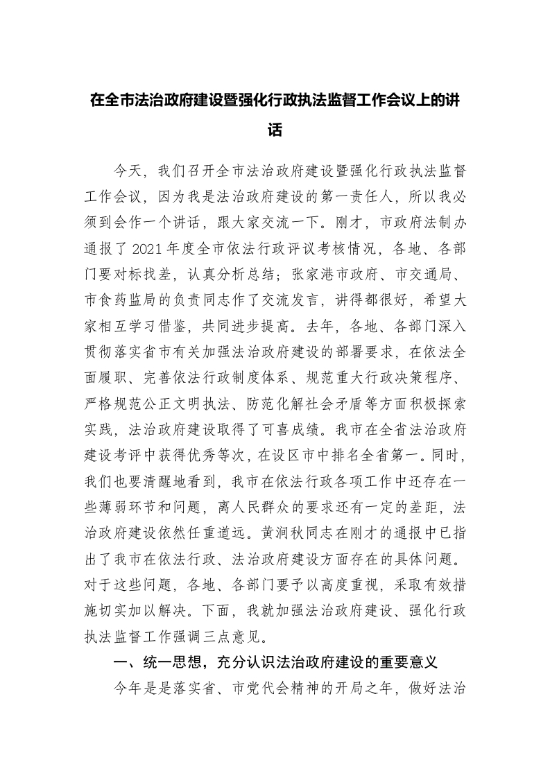 在法治政府建设暨强化行政执法监督工作会议上的讲话