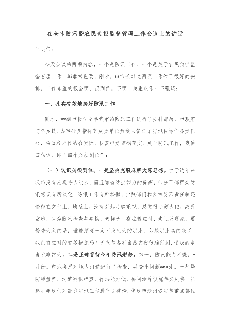 / 在全市防汛暨农民负担监督管理工作会议上的讲话