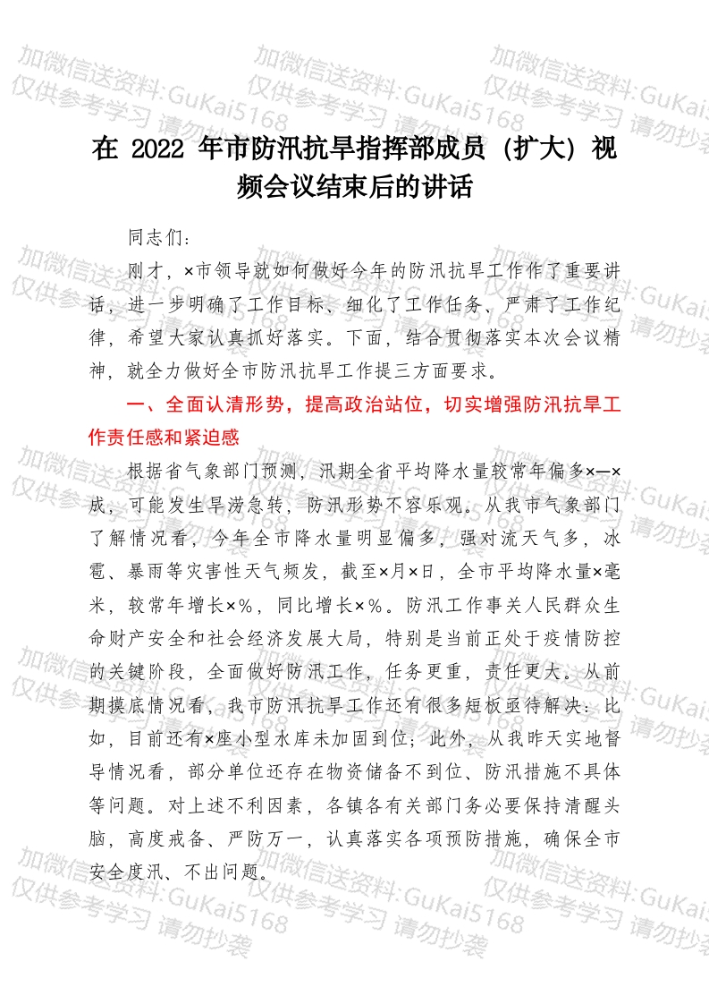 / 在2022年市防汛抗旱指挥部成员(扩大)视频会议结束后的讲话