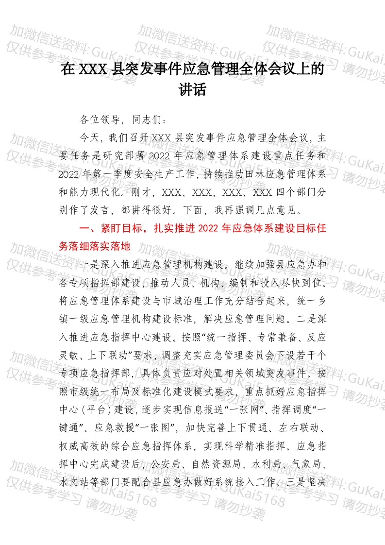 / 在XXX县突发事件应急管理全体会议上的讲话