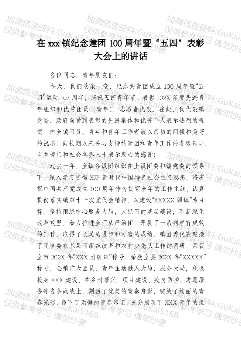 / 在xxx镇纪念建团100周年暨“五四”表彰大会上的讲话