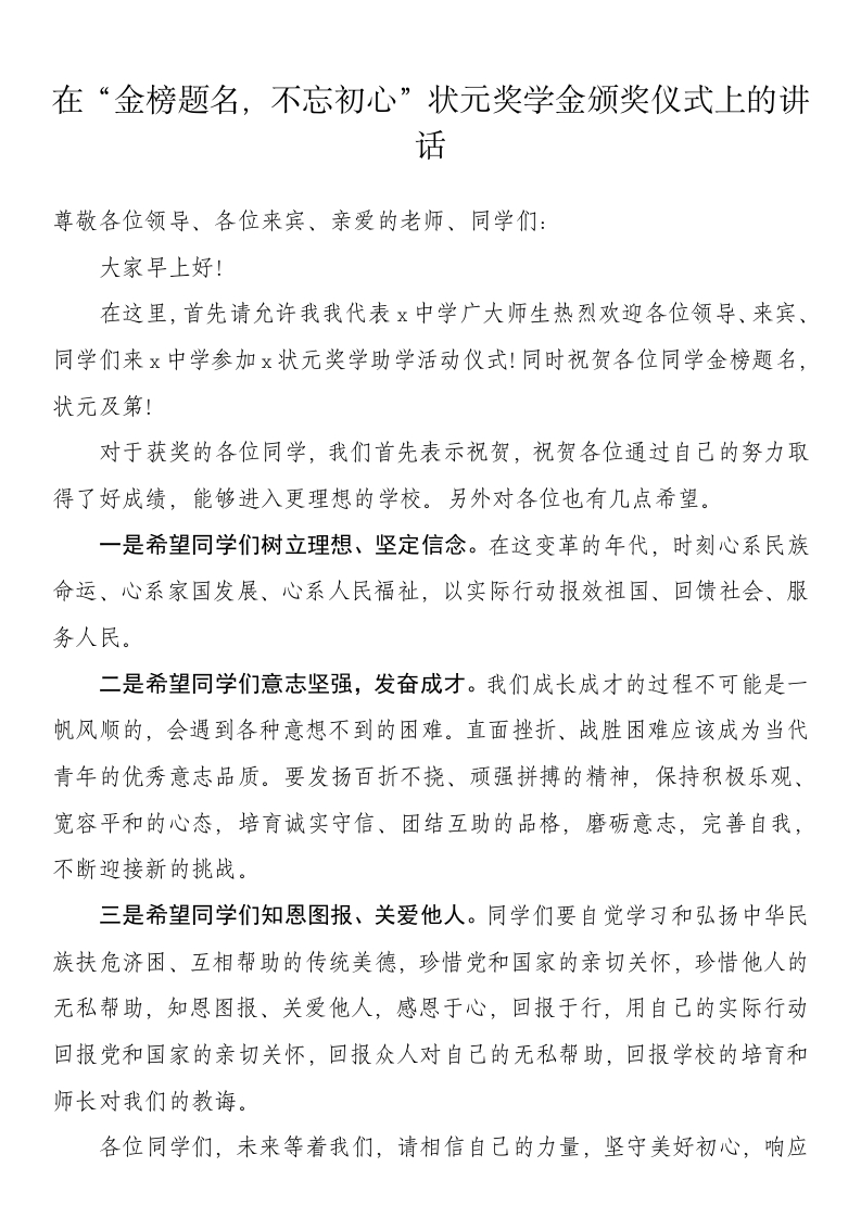 在“金榜题名,不忘初心”状元奖学金颁奖仪式上的讲话