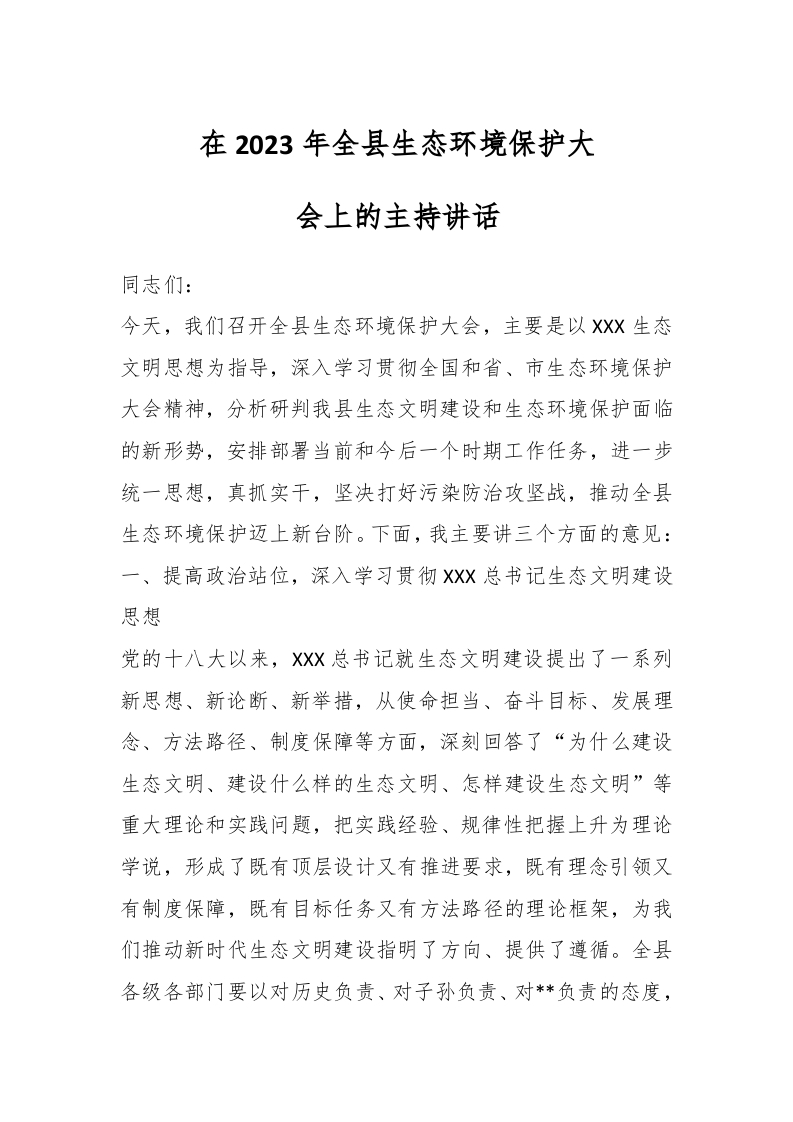 / 在2023年全县生态环境保护大会上的主持讲话