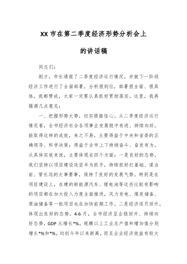 XX市在第二季度经济形势分析会上的讲话稿